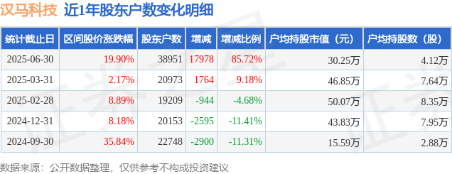 从股价来看,2025年3月31日至2025年6月30日,汉马科技区间涨幅为19.9%,在此期间股东户数增加1.8万户,增幅为85.72%。