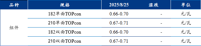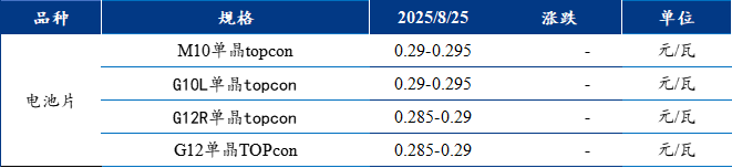 硅片市场全尺寸报价上涨0.05元/片。硅片上涨一方面由于上游硅料价格有所上调,硅片成本压力上涨,硅片报价跟涨。此外,反内卷政策的推进带来良好预期以及行业自律的要求下,报价不能低于成本,硅片企业积极响应下,报价上涨。虽硅片报价调涨,但成交暂未落地。一方面调涨时间过短,下游部分企业仍在观望。